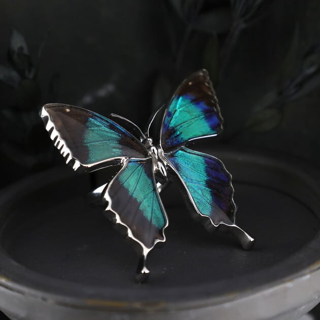 羽の色はもちろん羽の翅脈や模様など、自然が作り出したリアルな羽の質感や美しさを思い切り楽しめるサイズの蝶のリングは、これだけで存在感抜群です。