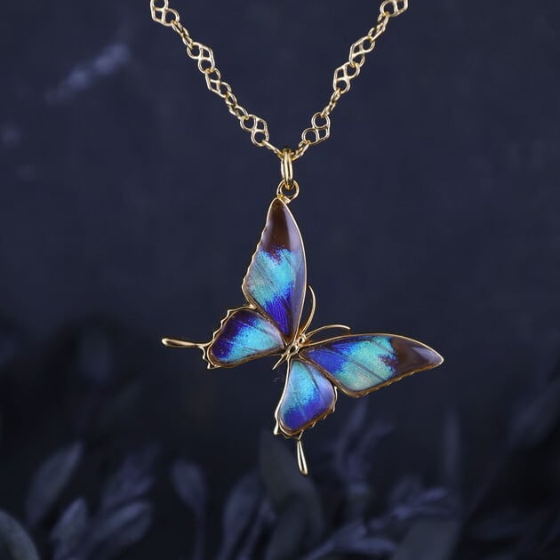シャープなフォルムが印象的なタスキアゲハをモチーフにした蝶のネックレス。