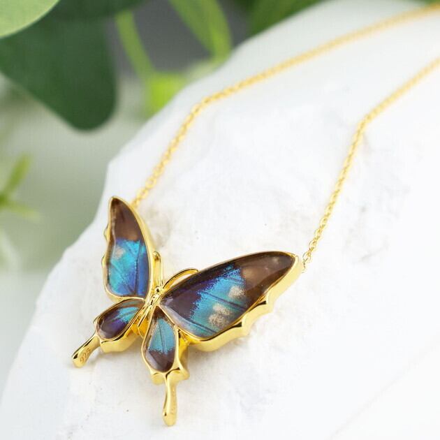 翅(はね)が欠けていたり、触角がない、傷が多い等の理由で標本としては利用できない蝶を優先的に使用し、アクセサリーへと新たに命を吹き込んでいます。 また、ワシントン条約等の法律は遵守しております。