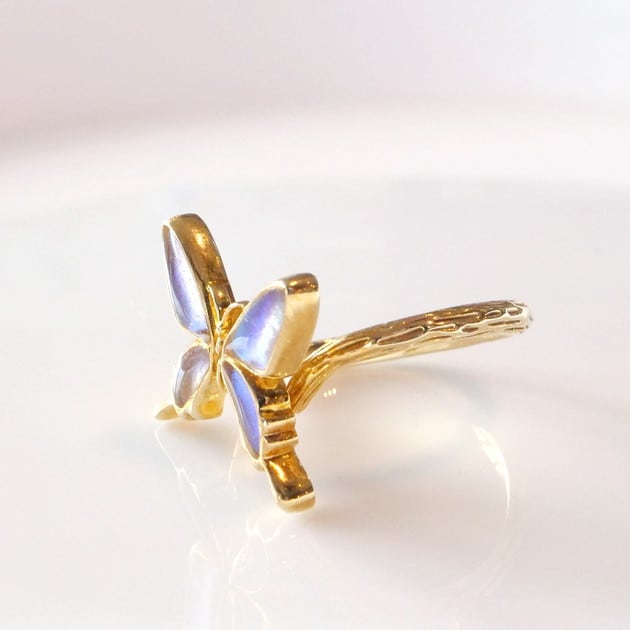 主張しすぎないサイズのアゲハ蝶は、リングに対してやや斜めにデザインされており、本当に舞い飛んできてふわりと指にとまったようなイメージです。