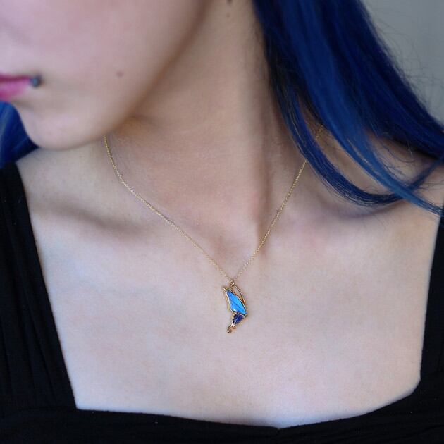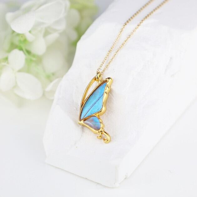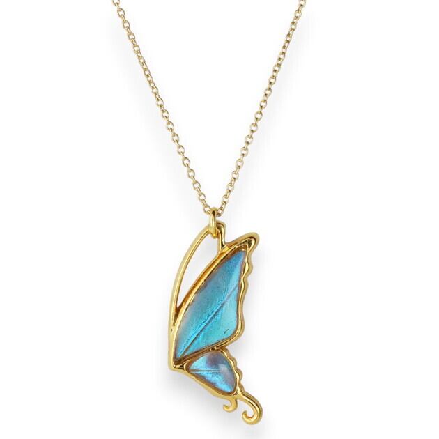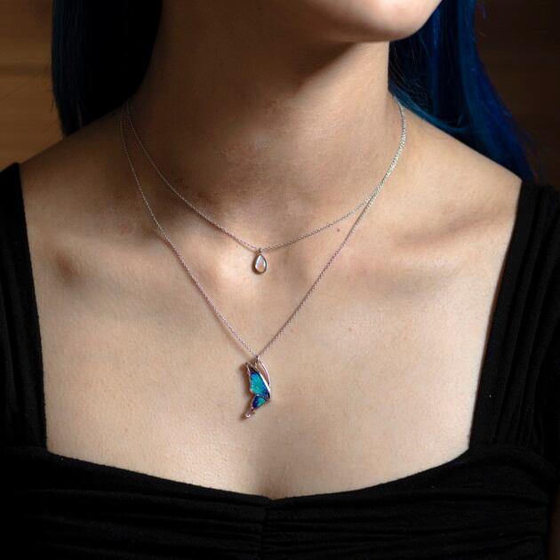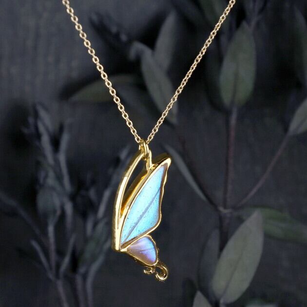こちらのネックレスは、蝶のフォルムをできるだけシンプルにしたことで、よりスタイリッシュなイメージになり、中に入れた羽の美しさがいっそう引き立ちます。