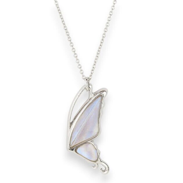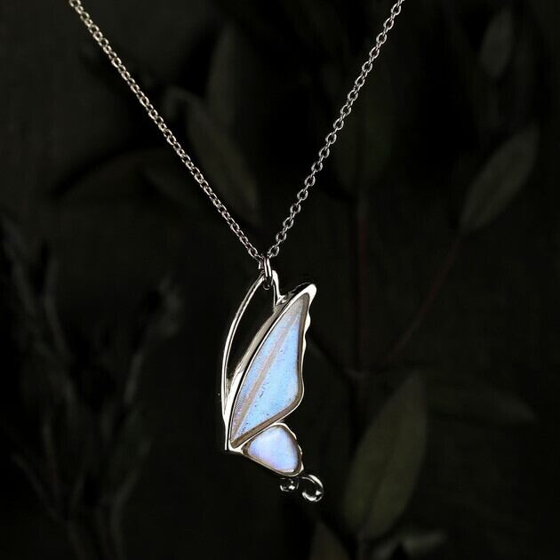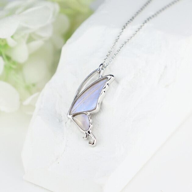 こちらのネックレスは、蝶のフォルムをできるだけシンプルにしたことで、よりスタイリッシュなイメージになり、中に入れた羽の美しさがいっそう引き立ちます。