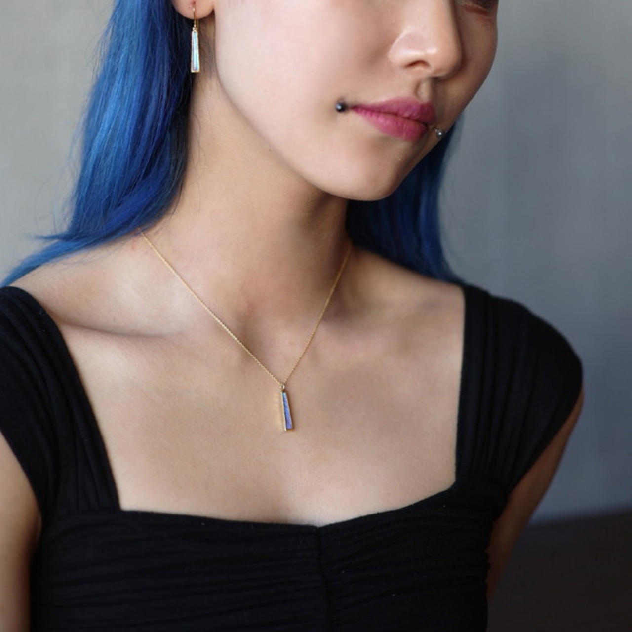 首回りをすっきりと見せてくれるスティックのネックレス。