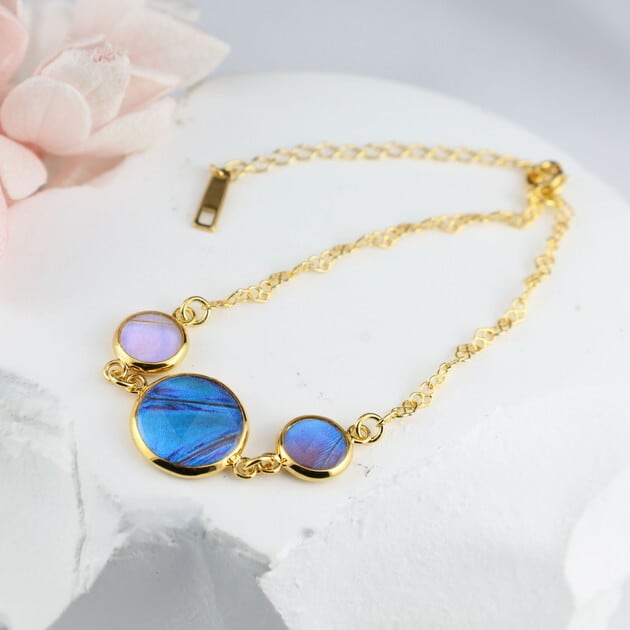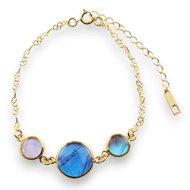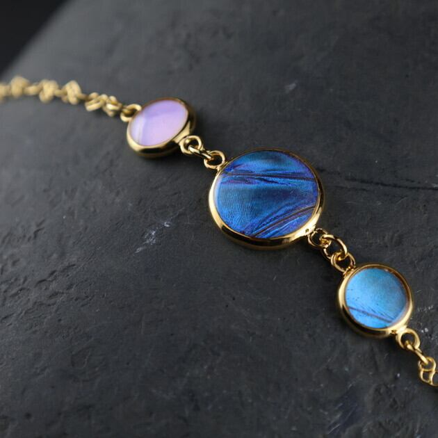 [Psyche/現品] [zps057g-scz]本物の蝶の翅 大小ラウンド3玉 ブレスレット [スルコウスキーモルフォ / カキカモルフォ / ゼフィリティスモルフォ]