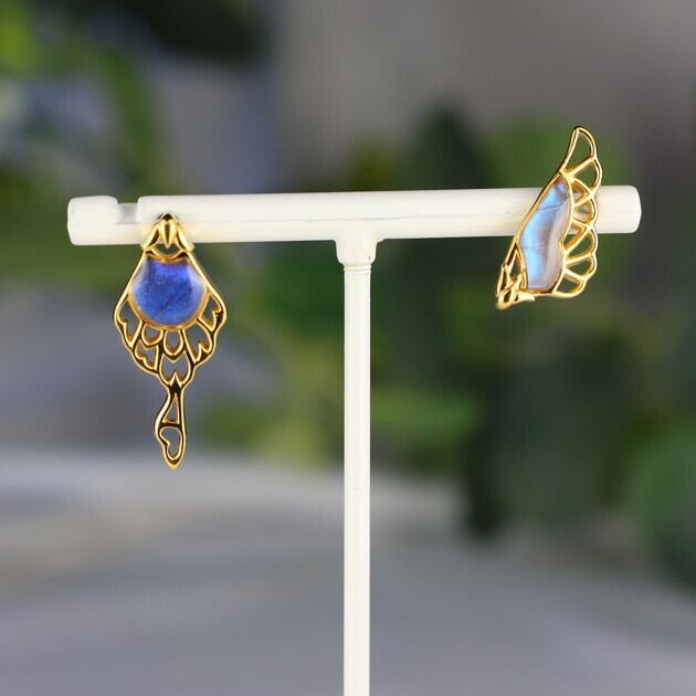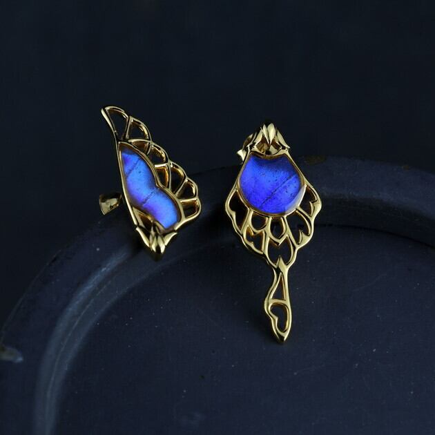 アシンメトリーに左右で着けるのはもちろん、片耳に複数ピアスホールがある方は翅を上下につけて片羽デザインとしても楽しめます。(左耳に上下に着けると蝶が前向き、右耳に上下に着けると蝶が後ろ向きになります)