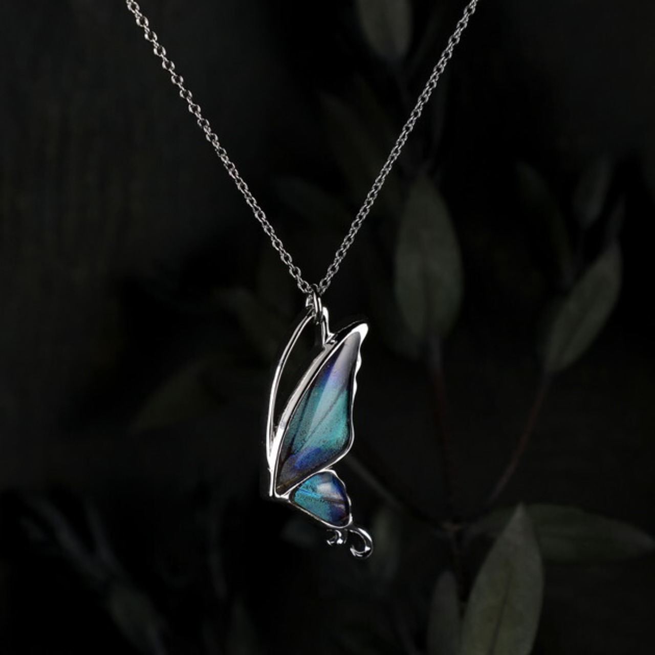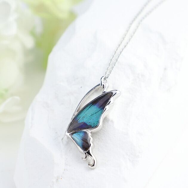 こちらのネックレスは、蝶のフォルムをできるだけシンプルにしたことで、よりスタイリッシュなイメージになり、中に入れた羽の美しさがいっそう引き立ちます。