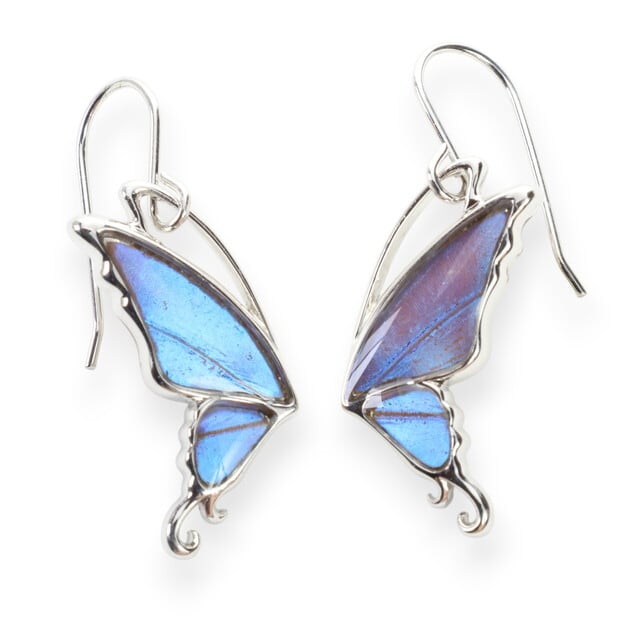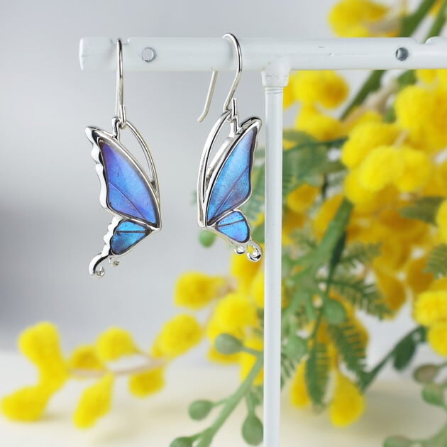 翅(はね)が欠けていたり、触角がない、傷が多い等の理由で標本としては利用できない蝶を優先的に使用し、アクセサリーへと新たに命を吹き込んでいます。 また、ワシントン条約等の法律は遵守しております。